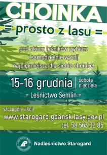 Nadleśnictwo Starogard, serdecznie zaprasza wszystkich zainteresowanych zakupem świątecznego drzewka na wspólną akcję własnoręcznego wycinania choinek, która w tym roku przeprowadzona zostanie w Leśnictwie Semlin, w dniach 15-16 grudnia od godziny 10:00 do 15:00 lub do wyczerpania zapasów.